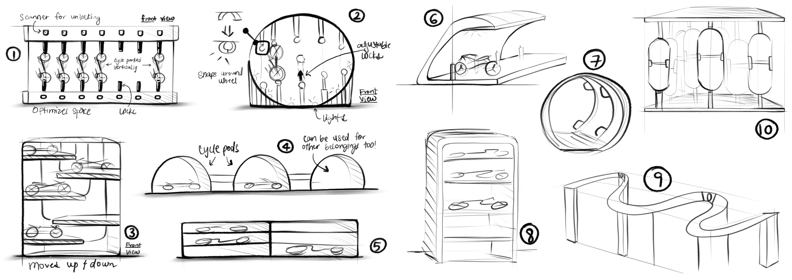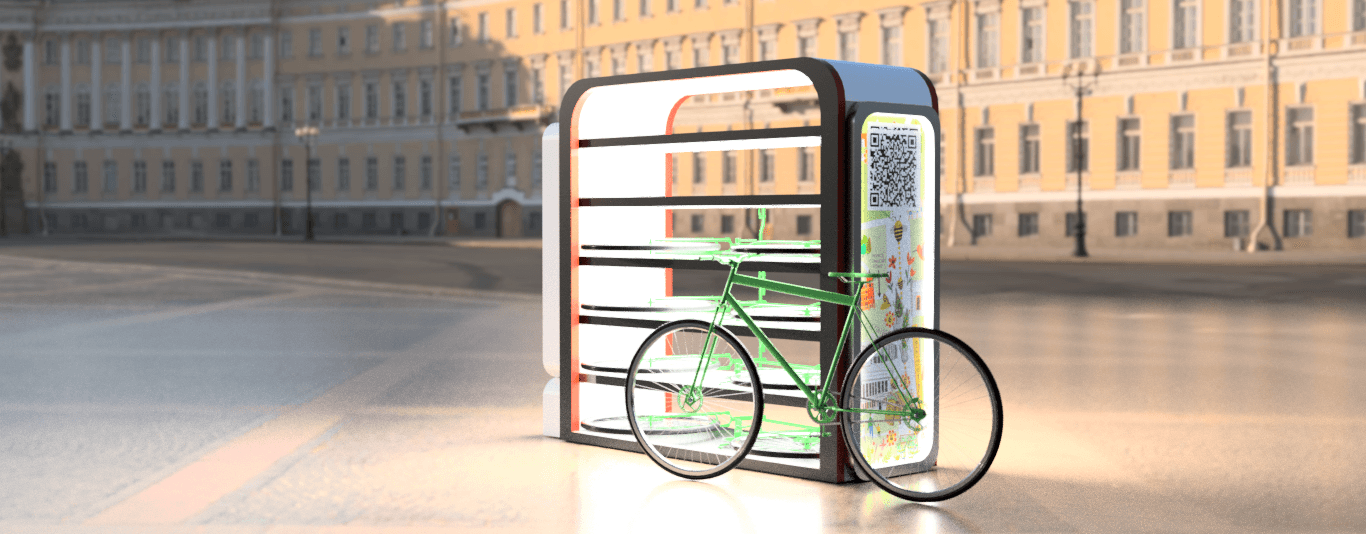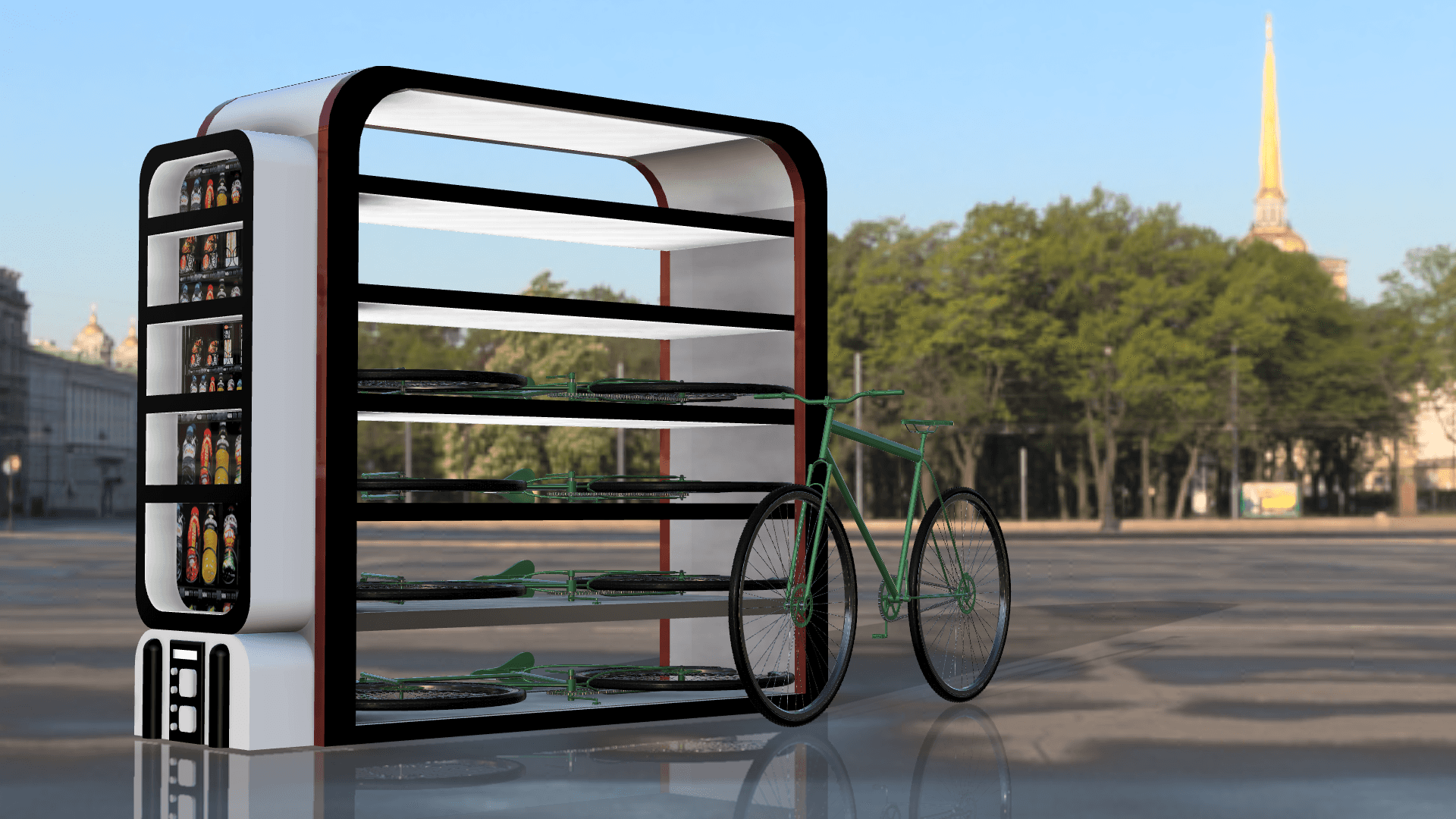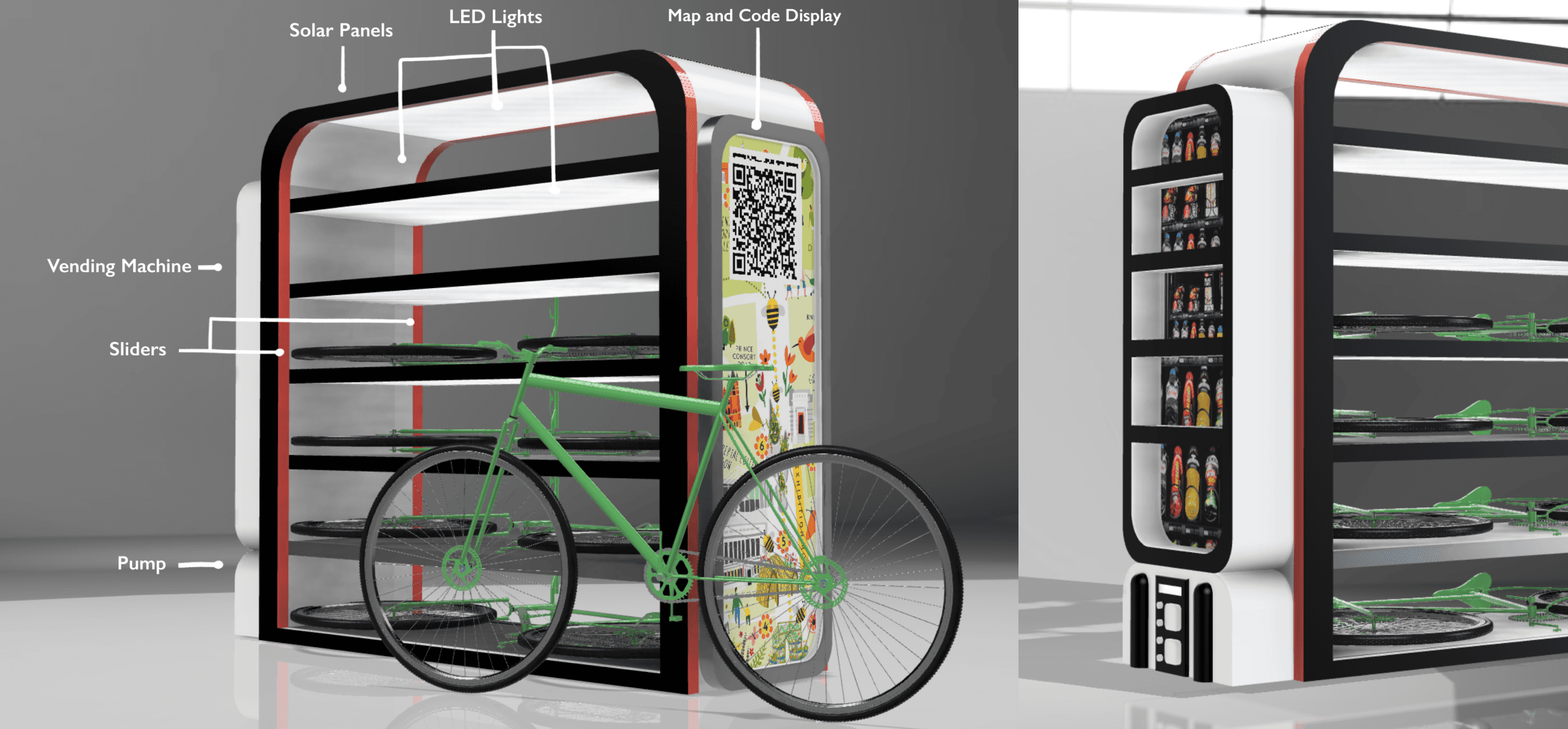 Rounded edges gives the form a sleek and elegant look. With a simple UI, the Cycle Bar is easy to use and hassle free. Additional features like vending machine, an air pump and a map display makes it practical. Space optimised, functional, and aesthetic, the Cycle Bar is the perfect bicycle parking spot for a safe and convenient parking!