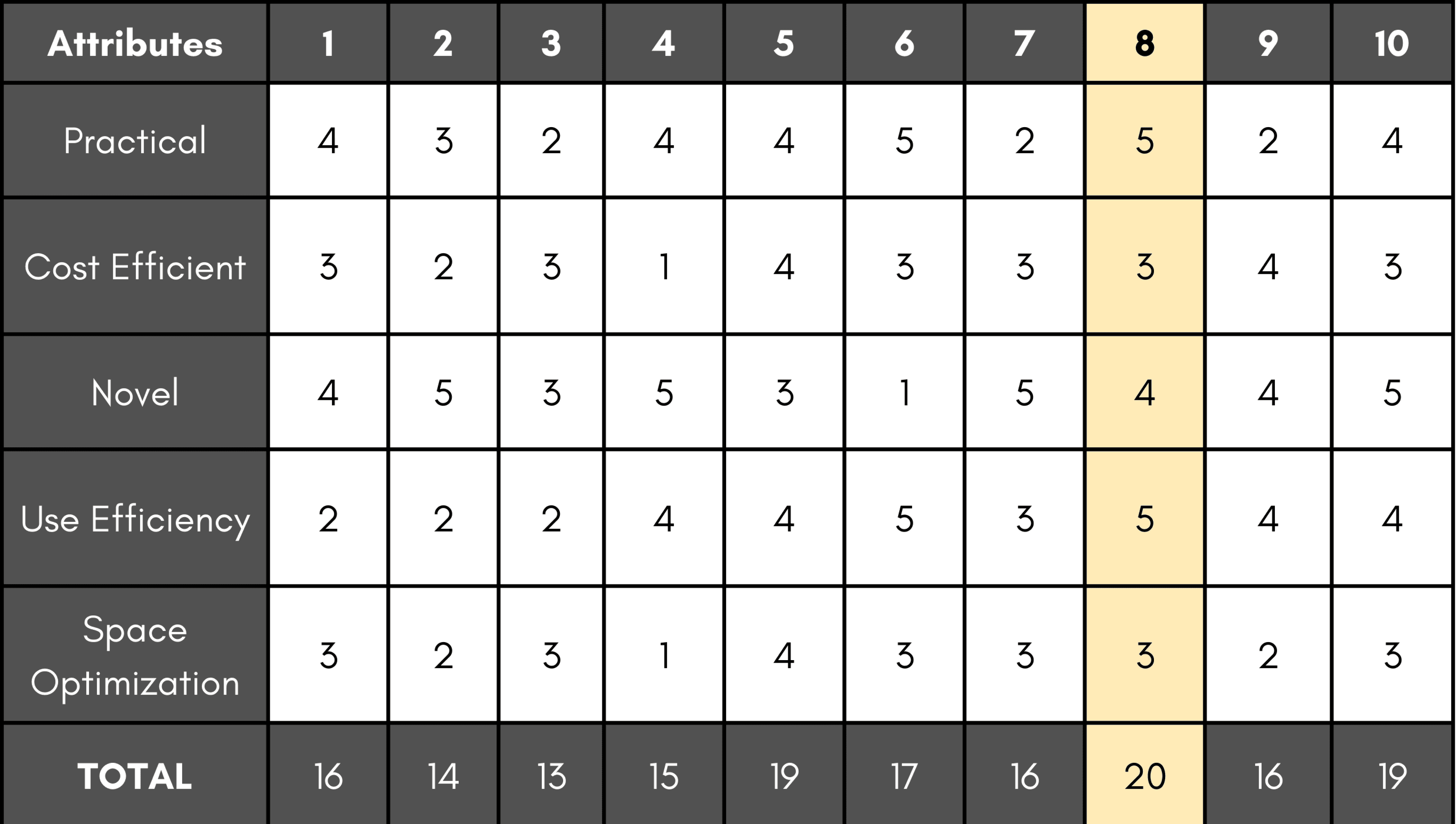Priority Matrix was used to rate the concepts based on how effective their attributes were. This was used to select the most efficient design.