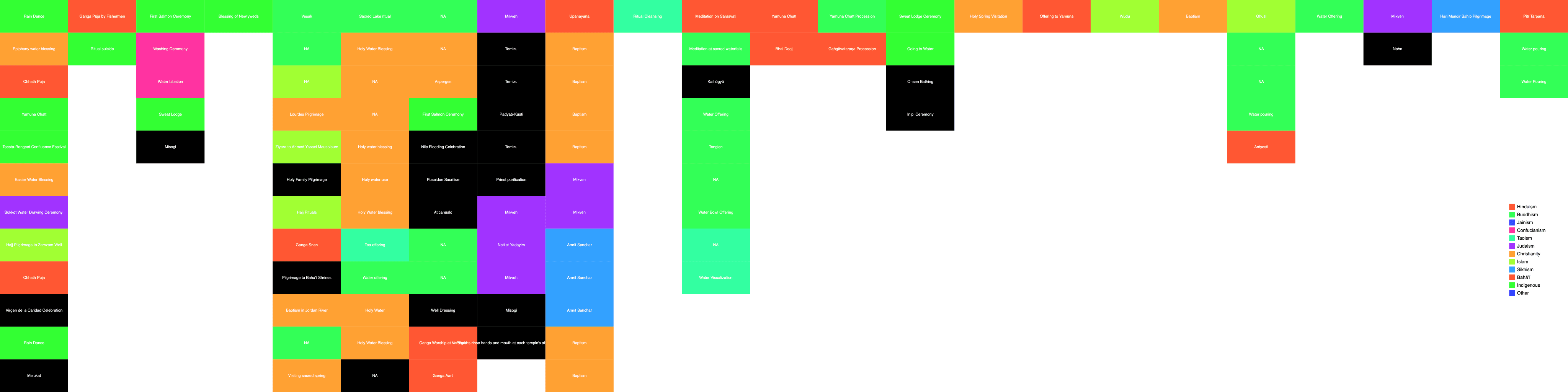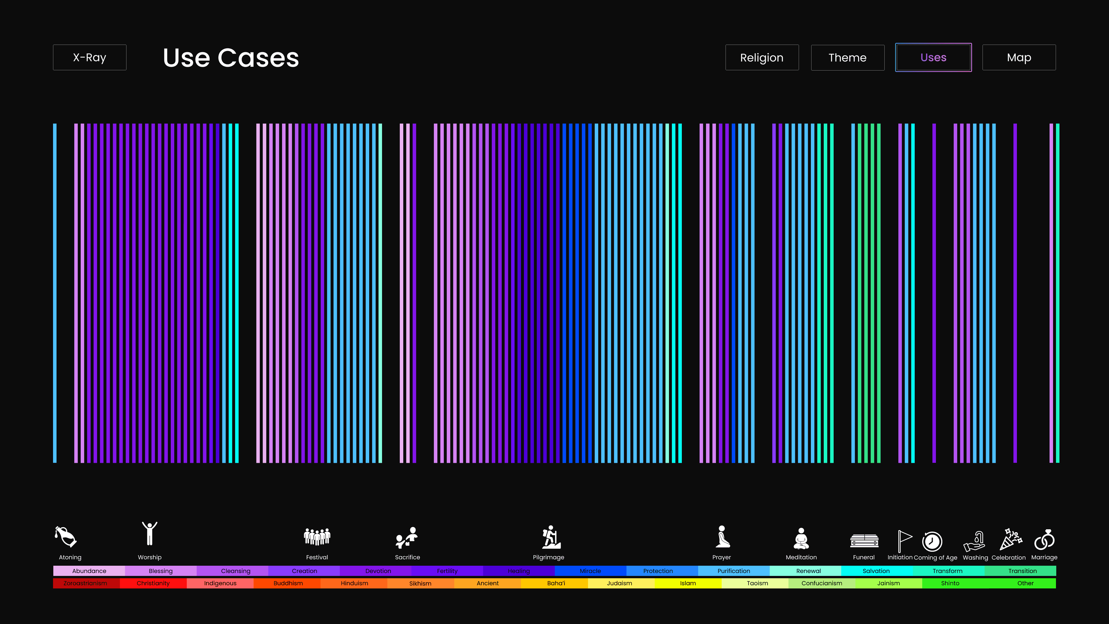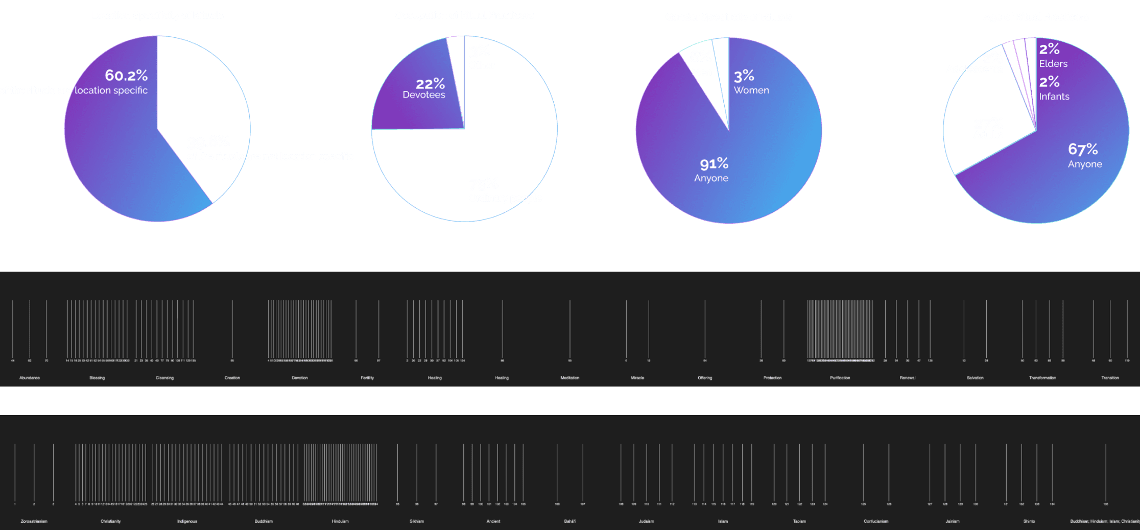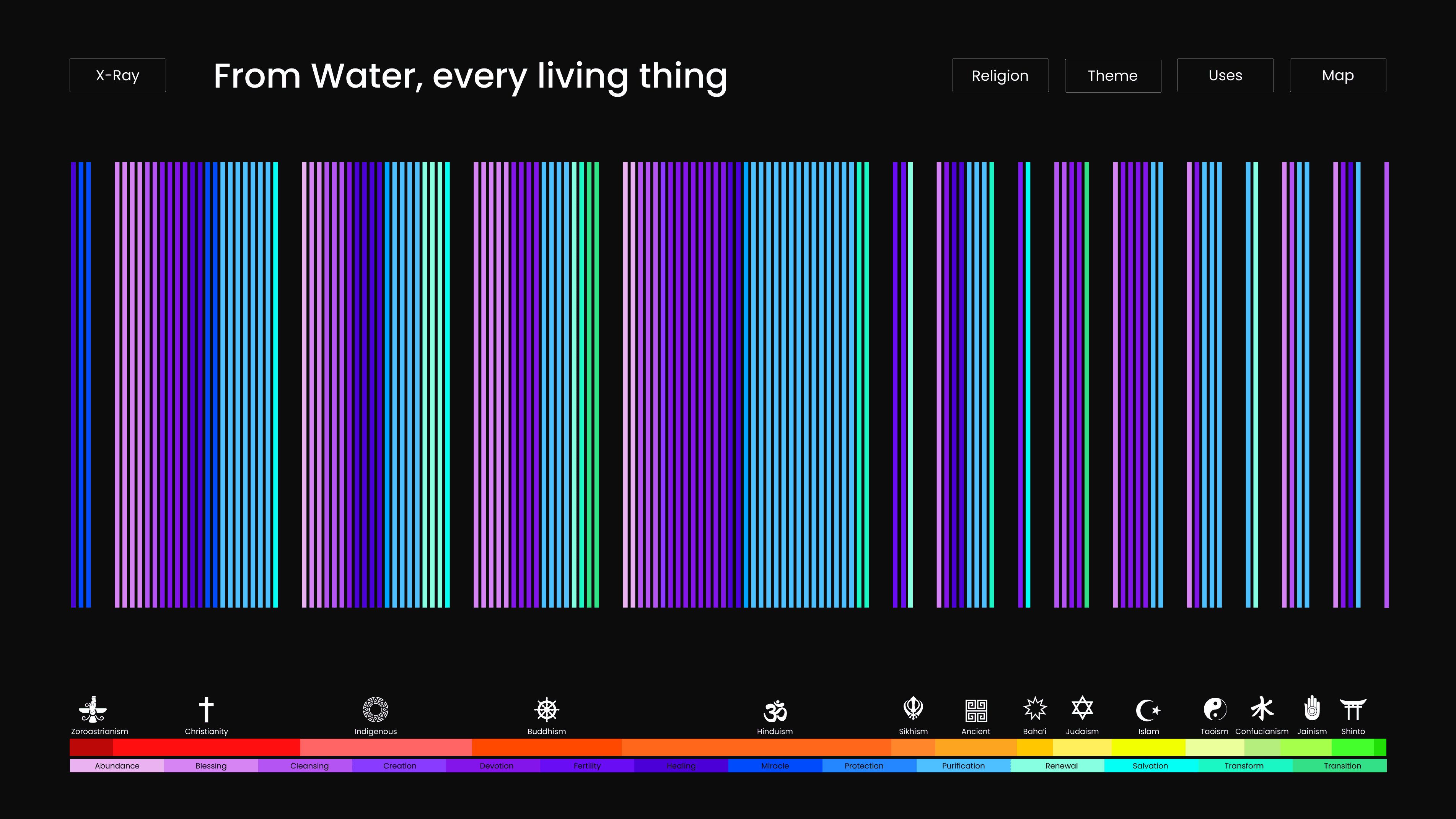We used Excel, P5 and Figma to explore the data we had built. We wanted to understand what the data was telling us, what were some interesting trends observed, and how was water being perceived across the different religions.