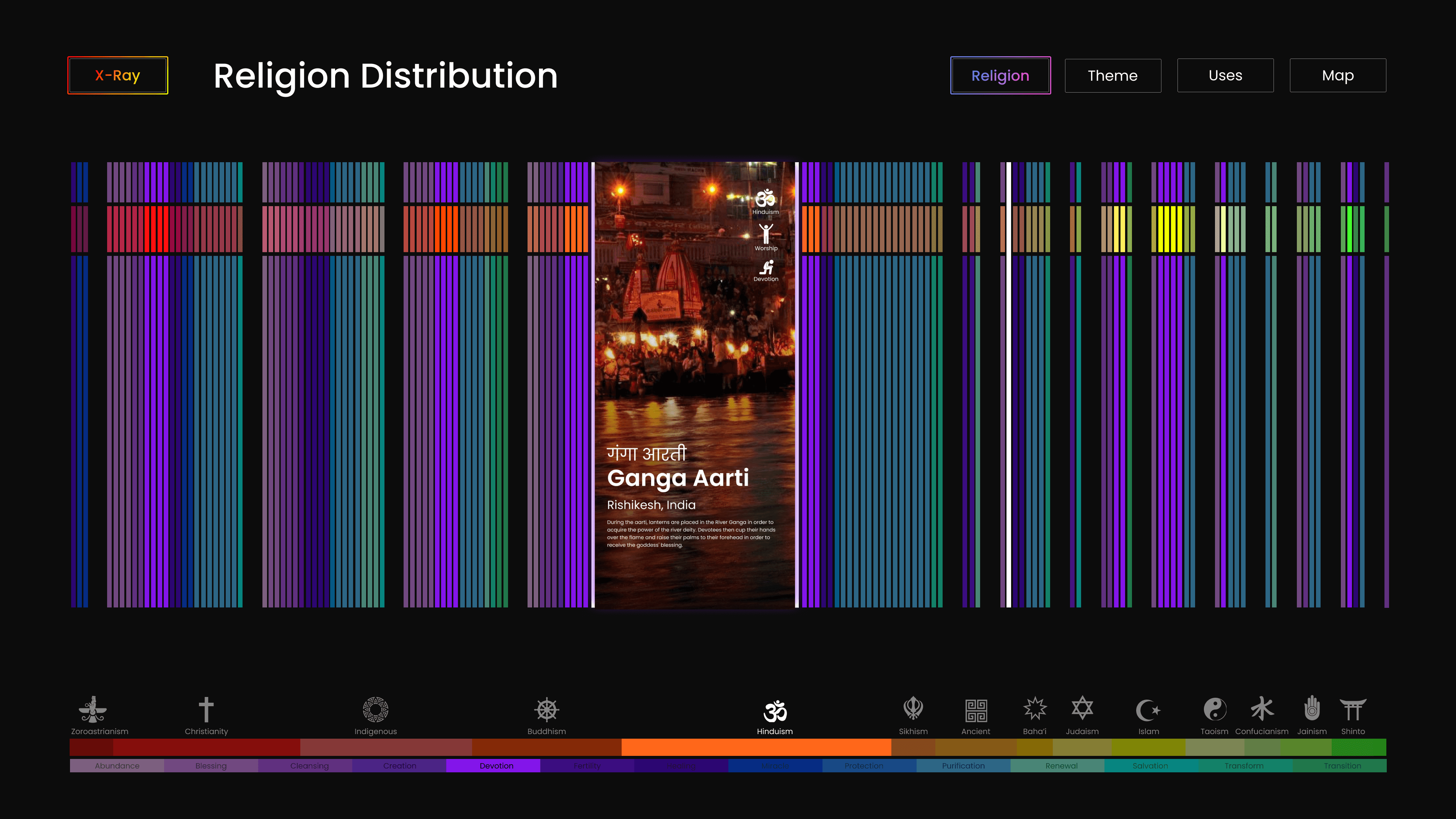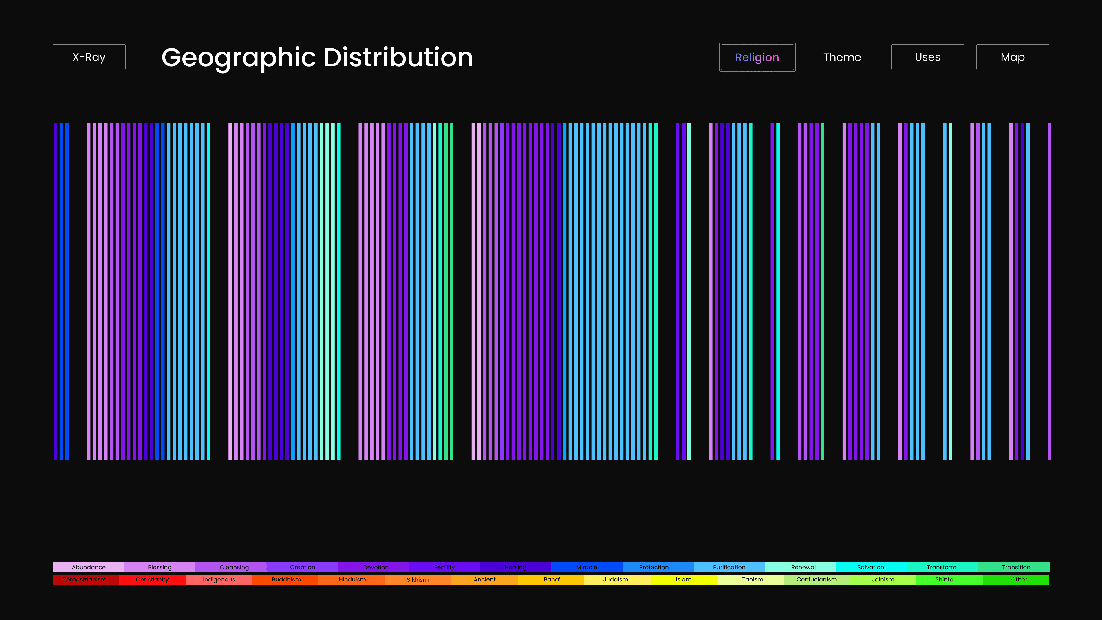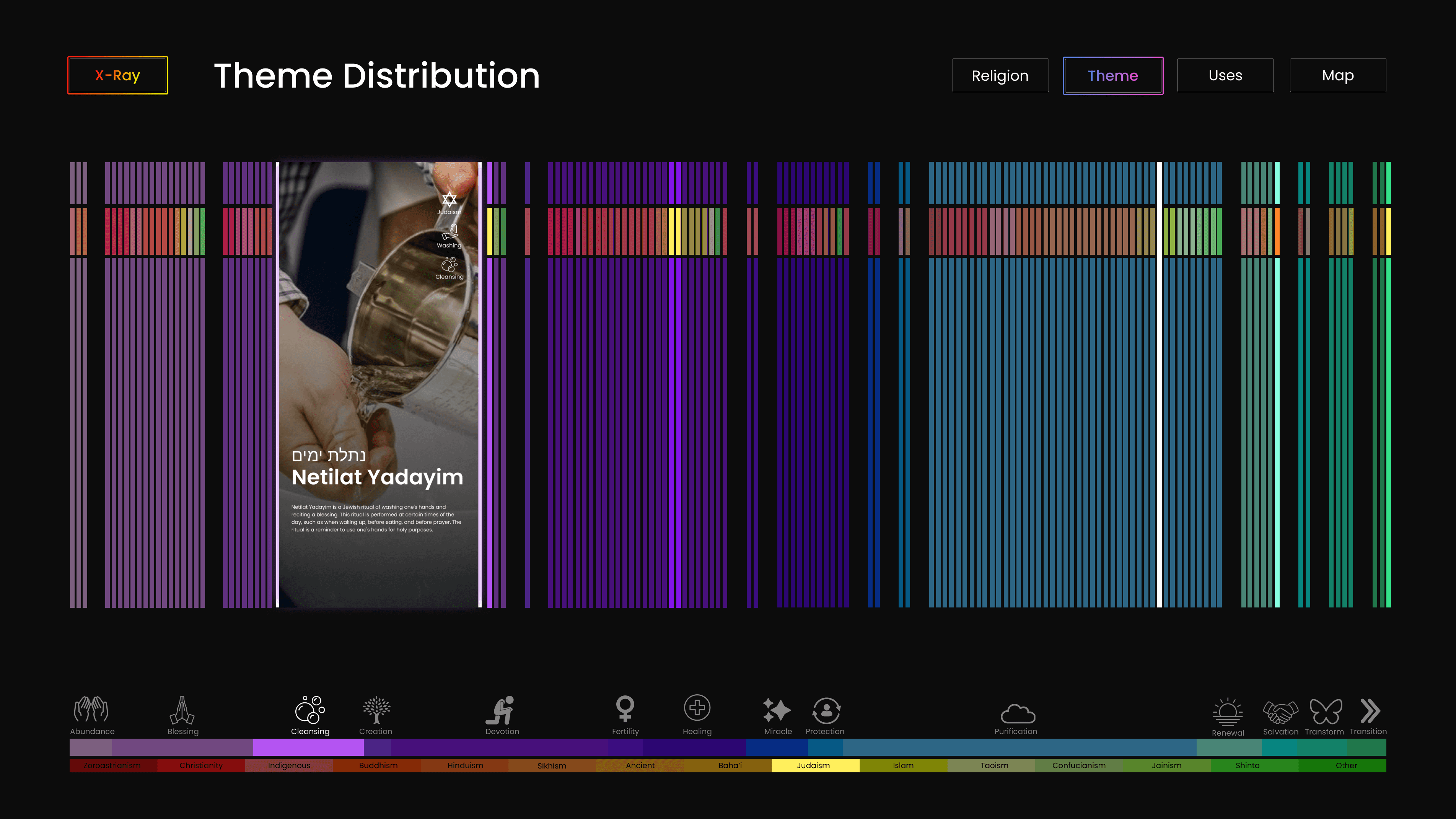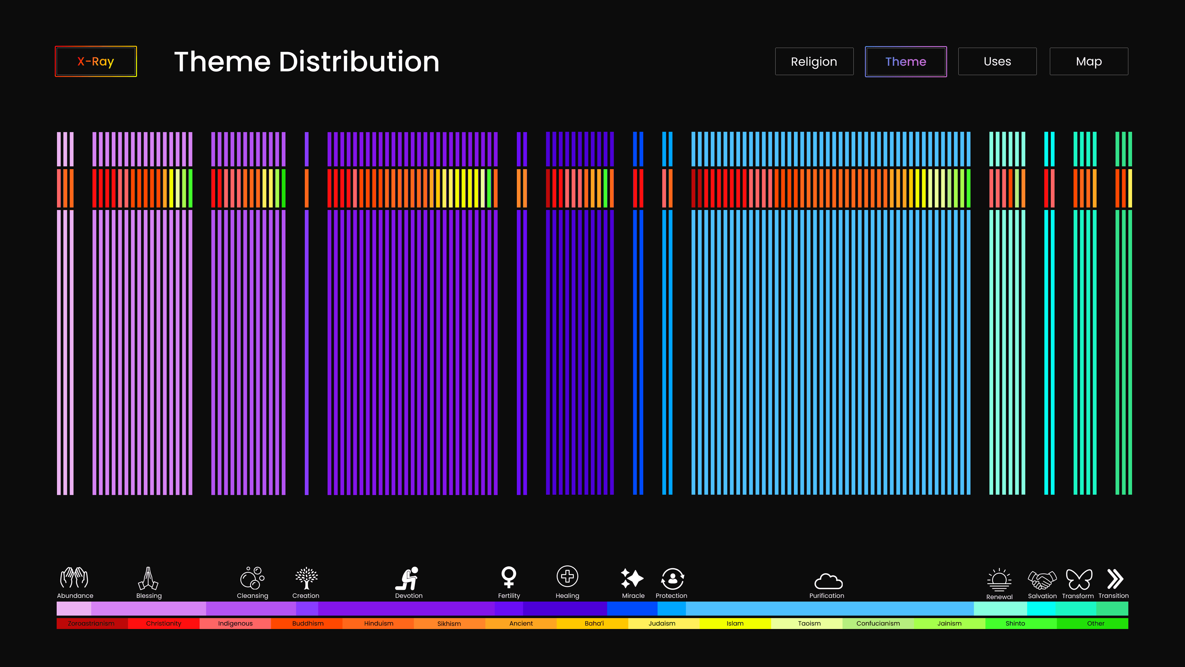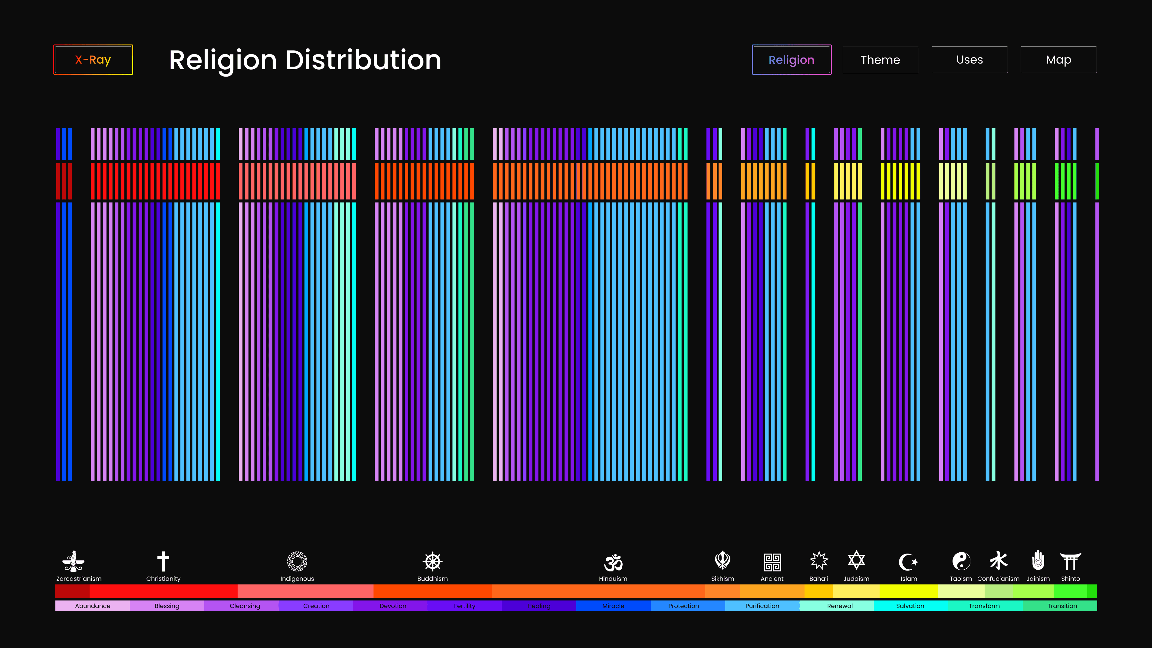 X-Ray mode will allow you to see both Religion and Theme distribution simultaneously (scroll below to see the still)